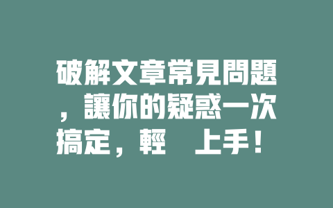 在資訊爆炸的時代,面對眾多文章與內容,常見問題總是讓人倍感困惑。這篇文章將深入探討如何有效地解答各種常見問題,讓讀者不再苦苦搜尋答案。我們將涵蓋文章製作過程中的關鍵要素,包括如何理解問題的核心,學習如何篩選信息,並以清晰的方式呈現答案。透過實用的技巧與方法,讀者可以輕鬆上手,迅速破解疑惑,提升閱讀與寫作的效率。 我們還將分享一些成功案例,讓大家看到透過解析常見問題所帶來的實際效果。無論你是寫作者、學生還是職場人士,這篇文章都將為你提供寶貴的見解與工具,讓你輕鬆掌握解答常見問題的技巧,從此在學習和工作中都能游刃有餘。