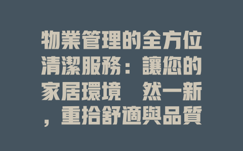 物業管理的清潔服務不僅是維護居住環境,更是提升居民生活質量的關鍵因素。每項服務都是為了確保居民在一個安全、衛生的環境中生活,從而獲得更高的生活品質。